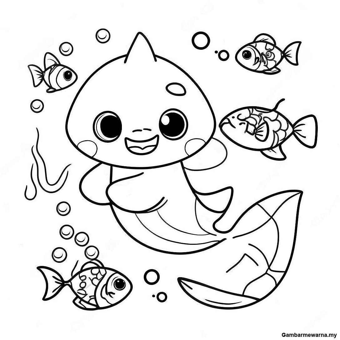 Baby Shark Bermain Dengan Ikan Berwarna-Warni Gambar Mewarna
