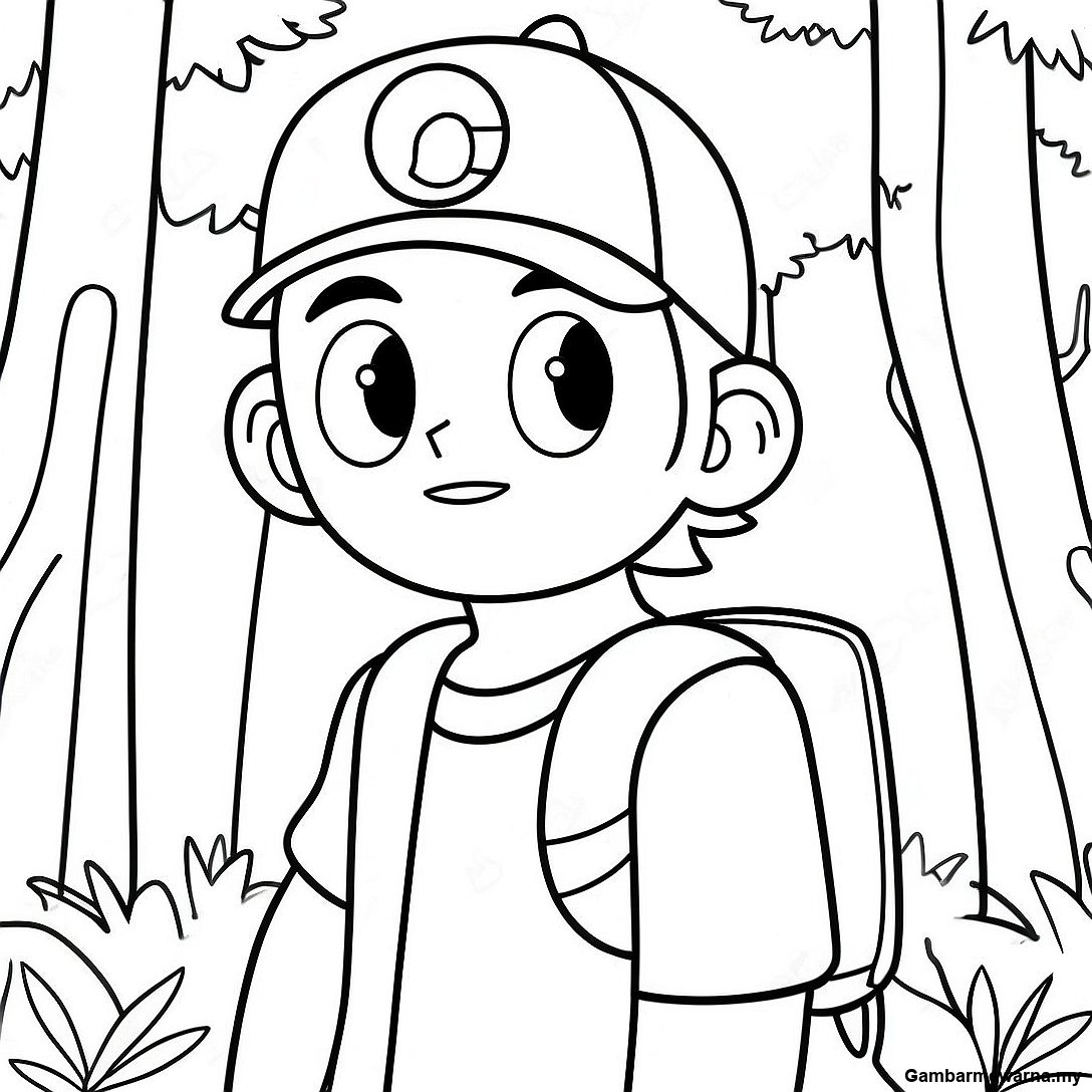 Halaman Mewarna Ash Ketchum Di Dalam Hutan