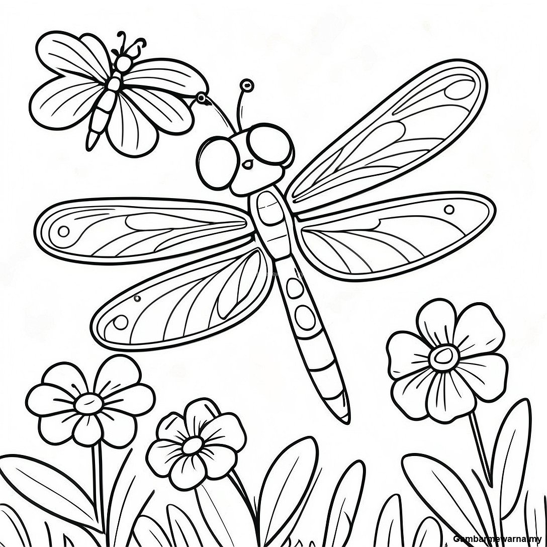 Halaman Mewarna Belalang Berwarna-Warni Di Taman Bunga