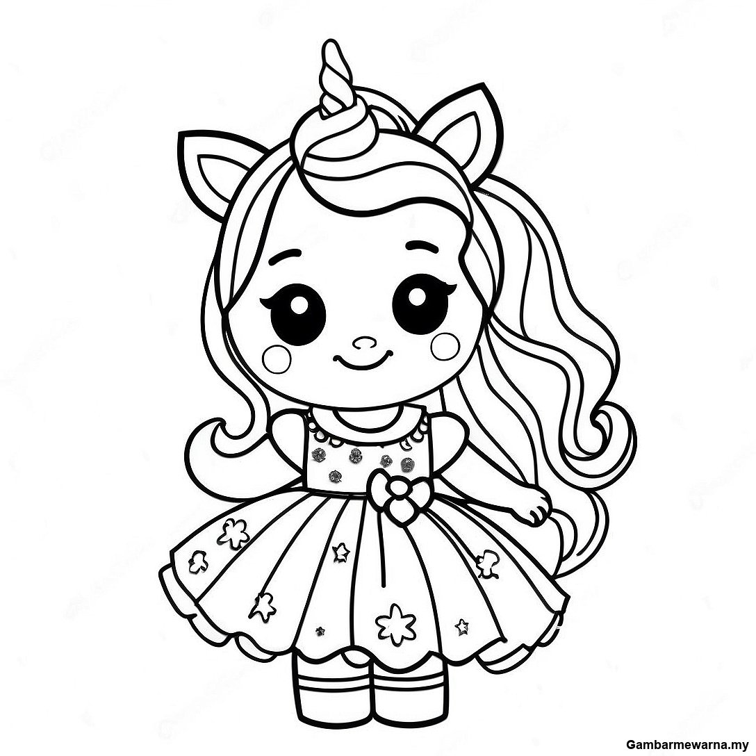 Muat turun PDF Boleh Cetak Halaman Mewarna Gadis Unicorn Dalam Pakaian Berkilau