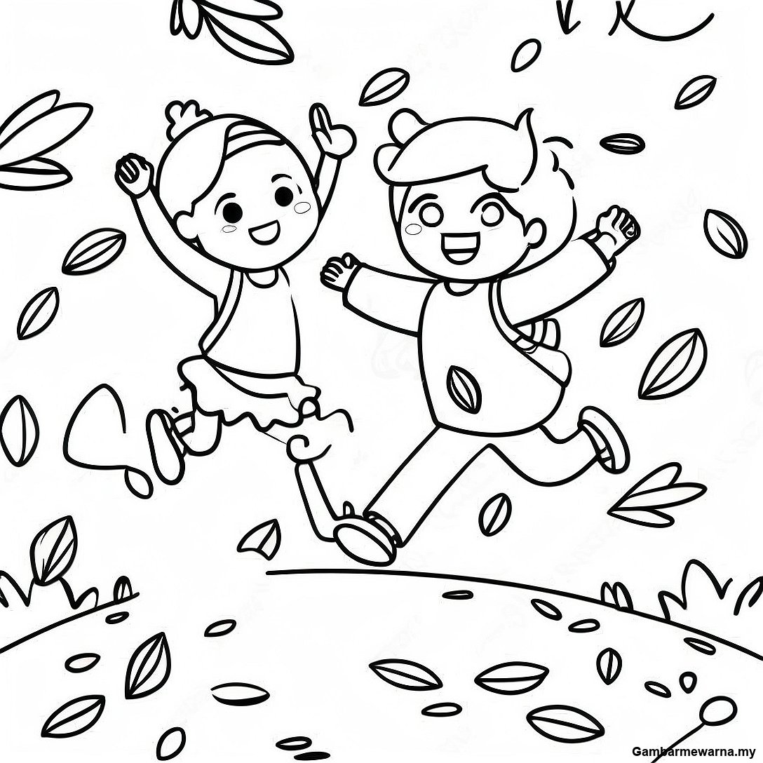 Halaman Mewarna Kanak Kanak Ceria Melompat Dalam Daun