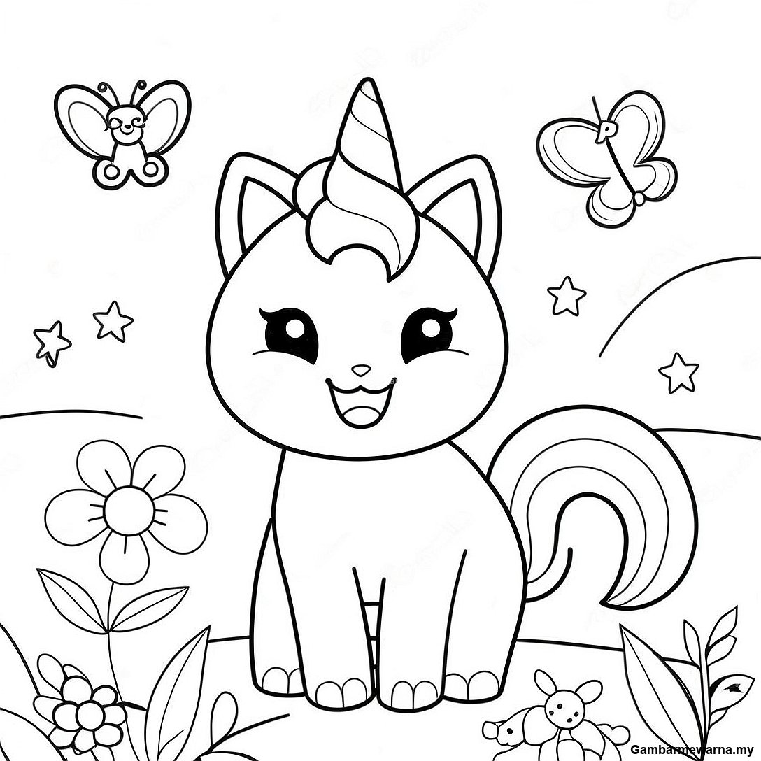 Halaman Mewarna Kucing Unicorn Comel Dengan Bunga