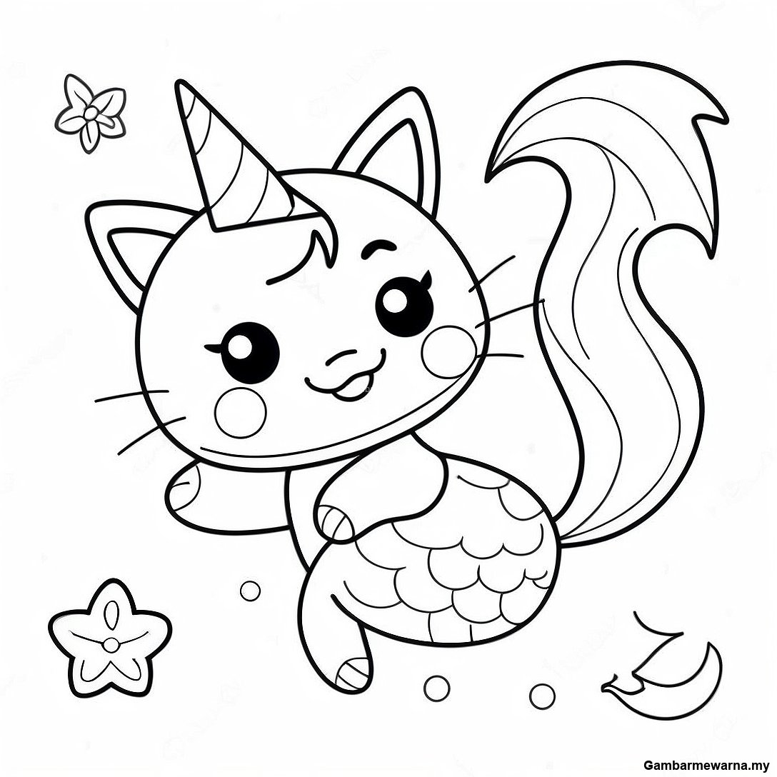 Halaman Mewarna Kucing Unicorn Puteri Duyung Comel