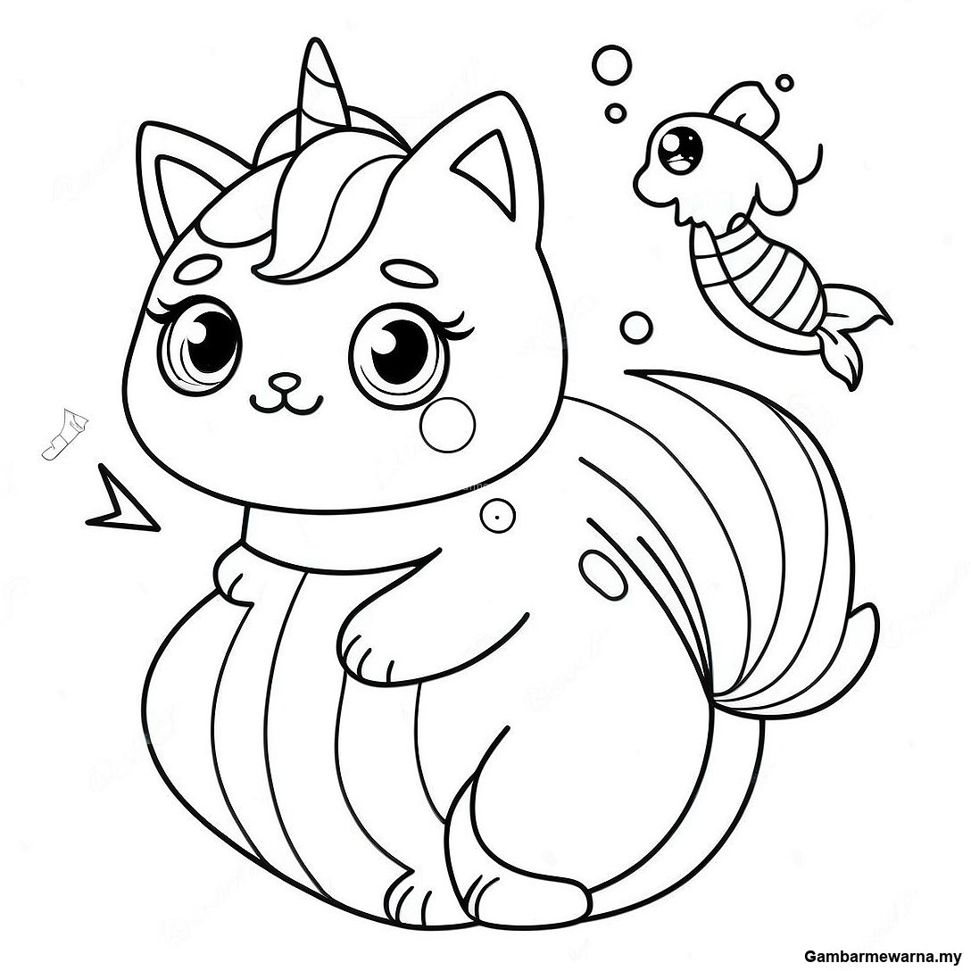 Halaman Mewarna Kucing Unicorn Puteri Duyung Comel