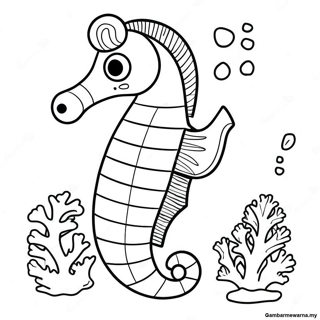 Halaman Mewarna Kuda Laut Ceria Dengan Karang