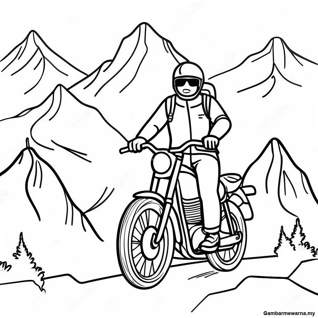 Halaman Mewarna Landskap Gunung Berwarna-Warni Dengan Penunggang Basikal