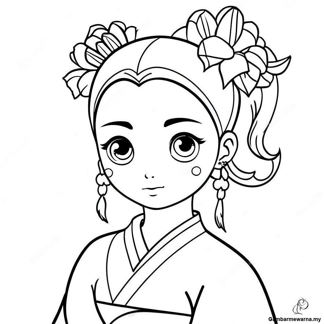 Halaman Mewarna Nezuko Dengan Penjepit Rambut Bunga