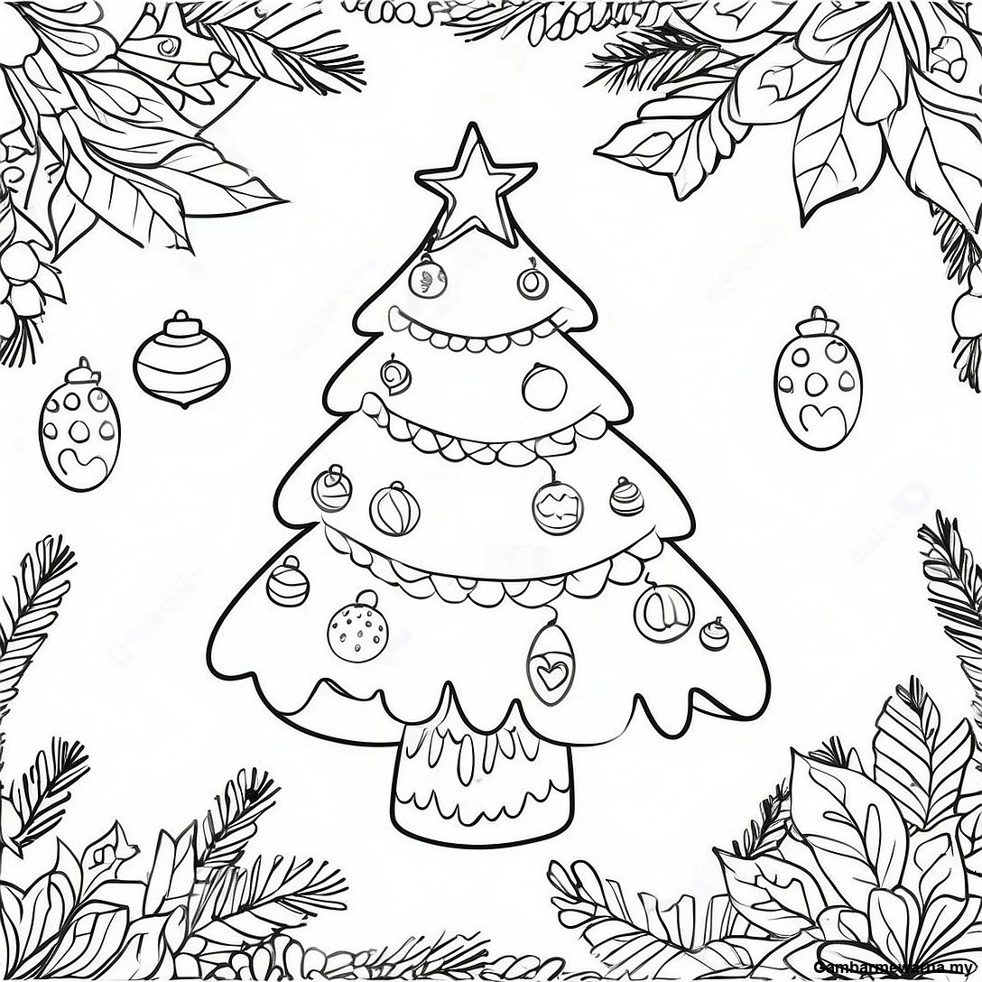 Muat turun PDF Boleh Cetak Halaman Mewarna Pokok Krismas Dengan Hiasan