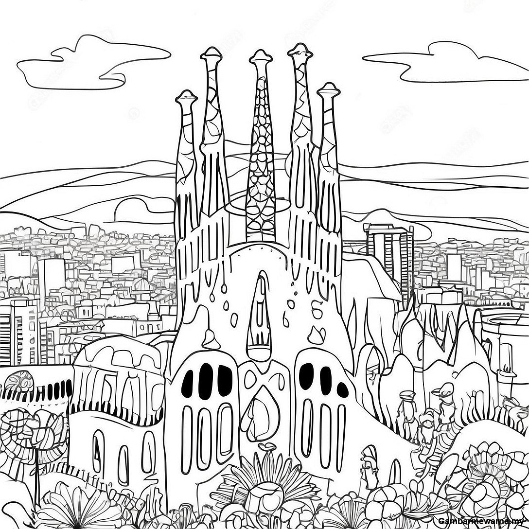 Halaman Mewarna Seni Bina Gaudi Barcelona