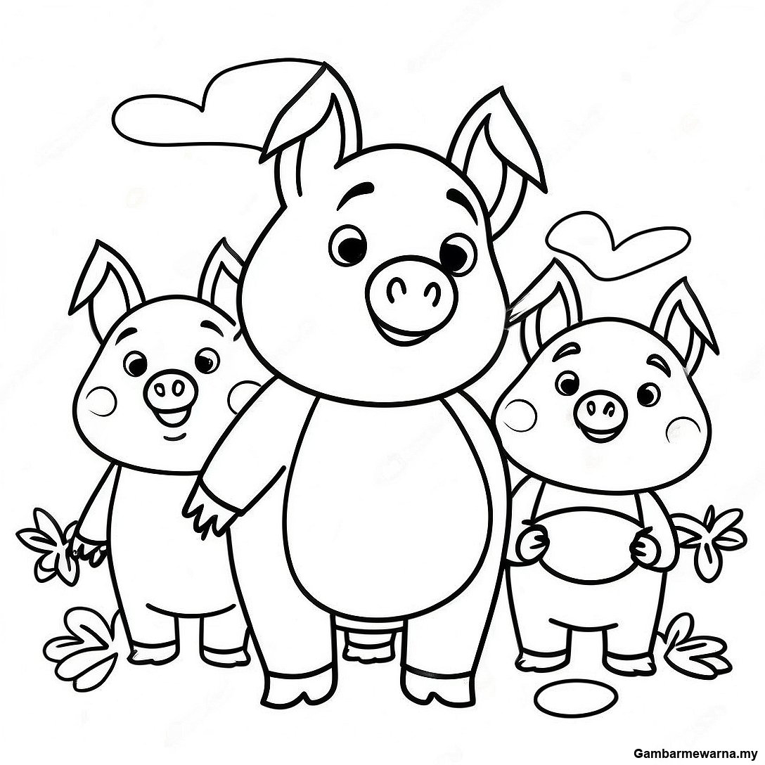Halaman Mewarna Tiga Babi Kecil Yang Gembira