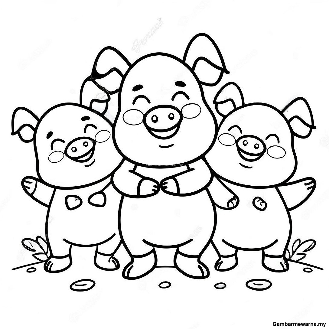 Halaman Mewarna Tiga Babi Kecil Yang Gembira