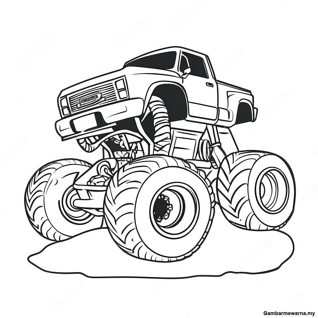 Halaman Mewarna Trak Monster Raksasa Menghancurkan Kenderaan Kecil