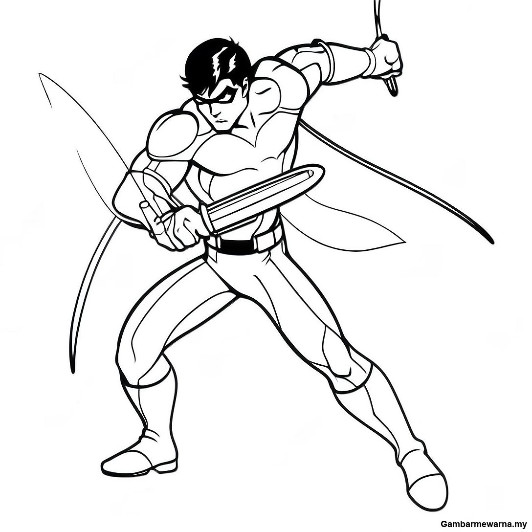 Laman Mewarna Nightwing Dengan Tongkat Bo