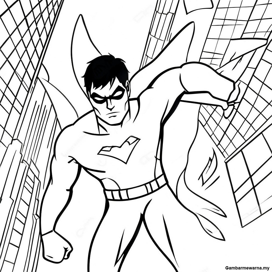 Muat turun PDF Boleh Cetak Laman Mewarna Nightwing Di Gotham City