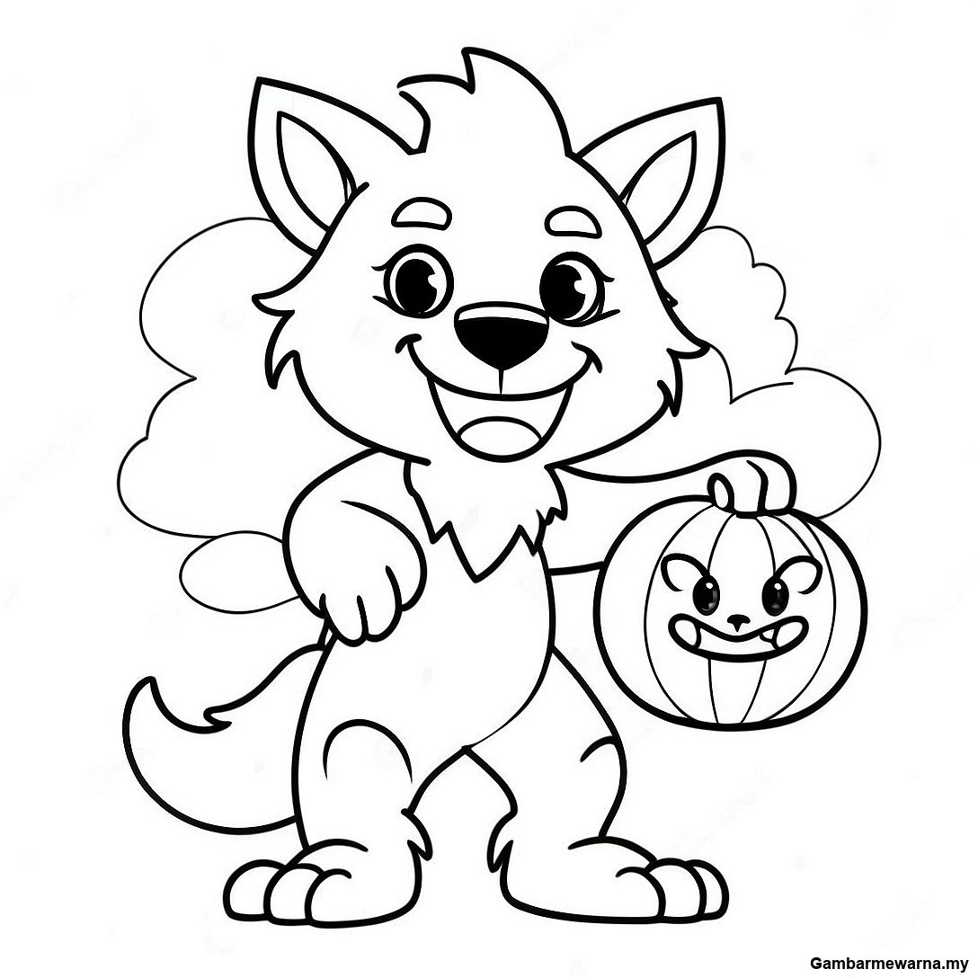 Serigala Jadian Kartun Comel Memegang Labu Halaman Mewarna