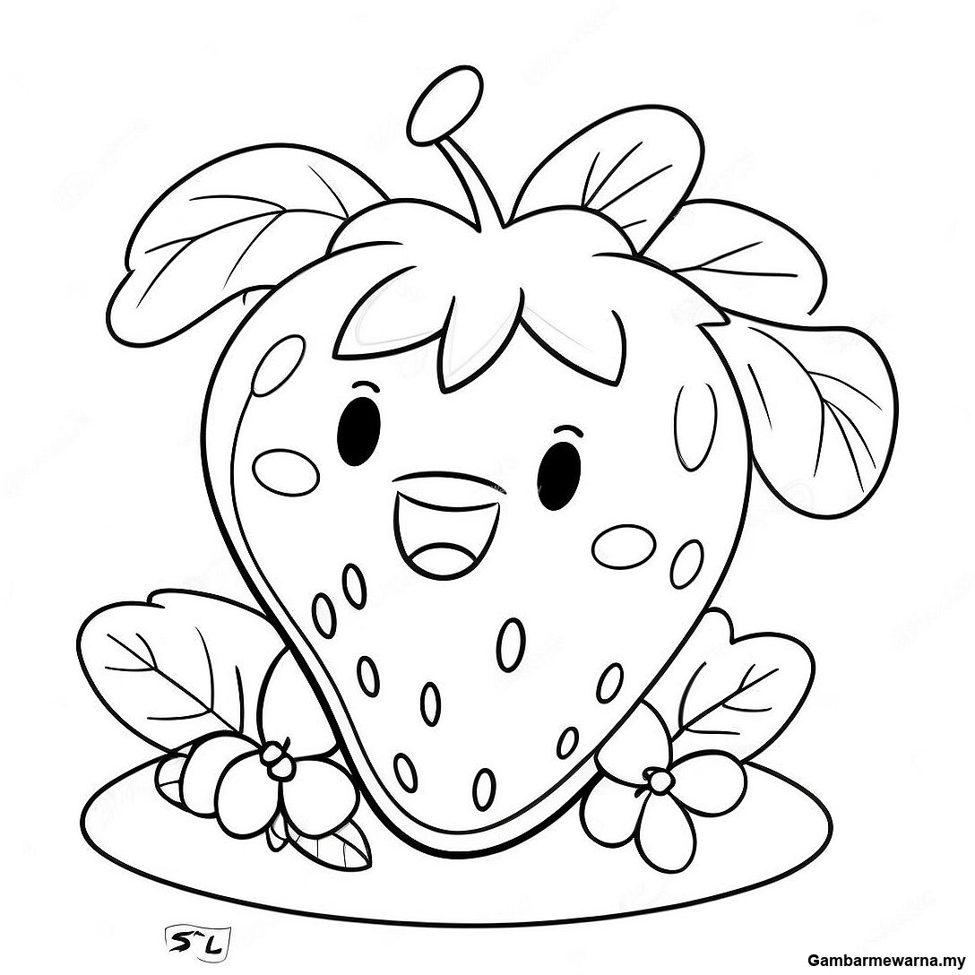 Strawberry Kartun Dengan Bunga Halaman Mewarna